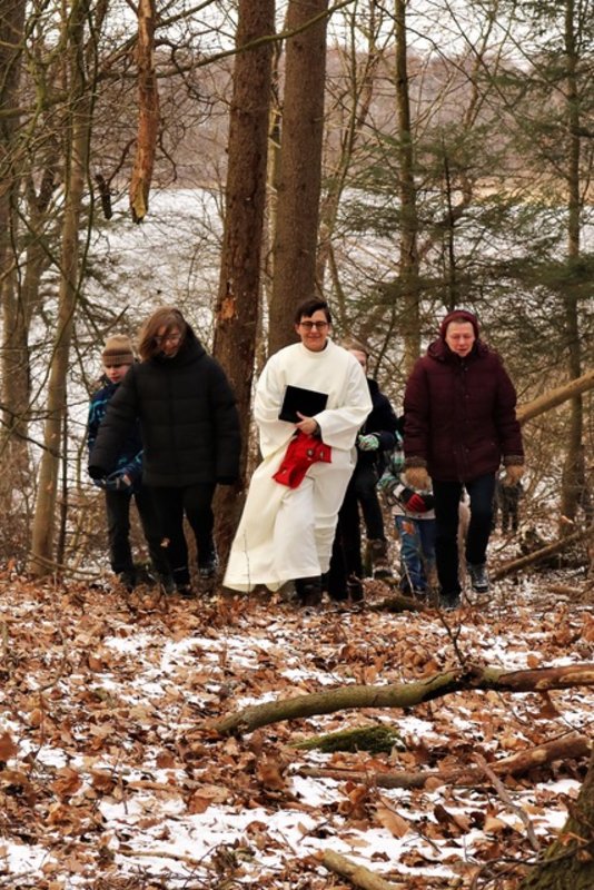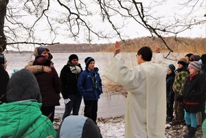 Bei flackerndem Kaminfeuer eröffnete Frauke Bregas den Gottesdienst, der aufgrund des stürmischen, kalten Ostwinds größtenteils im kleinen gemütlichen Wohnhaus der Hohburg stattfand. Aus gesammelten Naturmaterialien formten die Mädchen und Jungen des Pfadfinderstammes für ihre Täuflinge ein Kreuz auf dem Boden der Hütte. Sie symbolisierten damit schon zu Beginn das ganz besondere Motto, unter dem diese Taufe stand: Freundschaft, Vertrauen, Geborgenheit, der Zusammenhalt in einer Gemeinschaft und was dies für jeden Beteiligten bedeutet. Eingerahmt wurde der Gottesdienst musikalisch unter anderem durch Pfadfinderlieder, die die Pastorin auf Ihrer Gitarre begleitete. Die Taufe selbst wurde am Ufer des Westensees vollzogen. Die plötzlich aufbrechende Wolkendecke ließ die Sonne genau in dem Moment für einige Minuten hervor scheinen, als Pastorin Frauke Bregas zum ersten Mal mit der Hand eiskaltes Wasser aus dem See schöpfte. Sie tauchte die Taufgesellschaft in warmes Licht und begleitete die Täuflinge auf ihrem Weg ans Wasser. „Da werden Hände sein, die Dich tragen, und Arme, in denen Du sicher bist, und Menschen, die Dir ohne Fragen zeigen, dass Du willkommen bist“, sprach Frauke Bregas zum Abschluss der Zeremonie am Seeufer. Und dieses Zitat Khalil Gibrans wurde auch bei der Rückkehr in das Wohnhaus der Anlage noch einmal zu einem Symbol der Geborgenheit und Zusammengehörigkeit. Nach einer Umarmung durch die Angehörigen, trugen einige Pfadfinder ihre Täuflinge durch ein Spalier der übrigen zurück ins Haus. Im Schein des Feuers und im Licht der Taufkerzen, die als weitere Besonderheit diesmal ein liebevoll gestaltetes Geschenk des Pfadfinderstamms waren, sprachen die Pfadis die Fürbitten für ihre drei Freunde und Pastorin Frauke Bregas beendete den Gottesdienst. Mit Kuchen und auf dem Holzherd zubereitetem Kaffee klang der Nachmittag in gemütlichem Beisammensein aus.