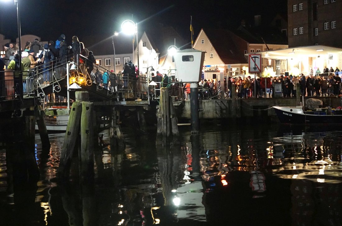 Nach seinem Impuls machten sich die Menschen auf den Weg, um die Brücke und das Ufer erleuchten zu lassen. An beiden Seiten des Hafens stehen viele zusammen, die Brücke ist voll. Alle gemeinsam singen „We shall overcome“ und zum Abschluss segnet Eckernfördes Propst Sönke Funck gemeinsam mit Pfarrer Johannsen die Anwesenden. Auch ein deutliches Zeichen für Zusammenhalt.