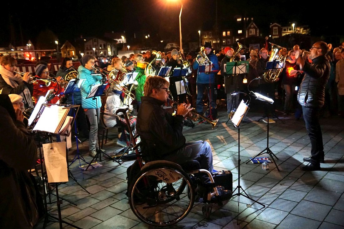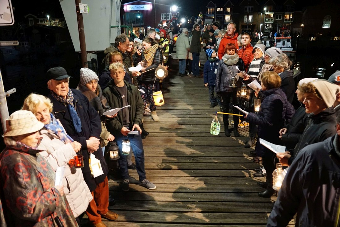 Eckernförde – Der Platz an der Holzbrücke am Hafen in Eckernförde ist voll. Überall stehen Menschen mit kleinen Lichtern oder Laternen. Die Aktion „Die Brücke leuchtet und klingt“, zu der die beiden ev.-luth. Kirchengemeinden der Stadt gemeinsam mit der katholischen Gemeinde Peter und Paul eingeladen haben, ist bereits vor Beginn ein voller Erfolg. Über 500 Menschen stehen zusammen, als Borbys Pastor Rainer Kluß die Anwesenden begrüßt: „Dass so viele gekommen sind, das ist ganz wunderbar.“ Kurz darauf nimmt Kluß wieder seinen Platz bei den Bläsern ein, denn vor allem ist er an diesem Tag für die musikalische Begleitung da. Die Brücke soll ja nicht nur leuchten.