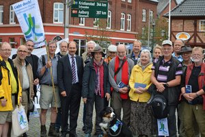 Nach einer kurzen Stärkung wurden Sie nun von Bürgermeister Pierre Gilgenast und Propst Matthias Krüger begrüßt. „Beim Pilgern sieht man die Schöpfung in seiner Vielfalt und das, was die Erde liebens- und lebenswert macht“, sagte Bürgermeister Gilgenast bei der Begrüßung. Dann führt er weiter aus, dass das erste Ziel Paris sei und das zweite Ziel ein Beitrag zur Klimagerechtigkeit um das Klima unter zwei Grad Erwärmung pro Jahr zu halten. Zum Schluss wünschte er allen Pilgern auf der Wanderschaft viele schöne Begegnungen und ein gutes Ankommen in Paris. Propst Matthias Krüger begrüßte im Anschluss die Pilger mit den Worten: “Sie setzen einen Schritt vor den anderen, um ein Ziel zu erreichen. Wir fühlen uns geehrt, dass der Pilgerweg durch unser schönes Rendsburg führt“.