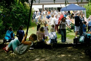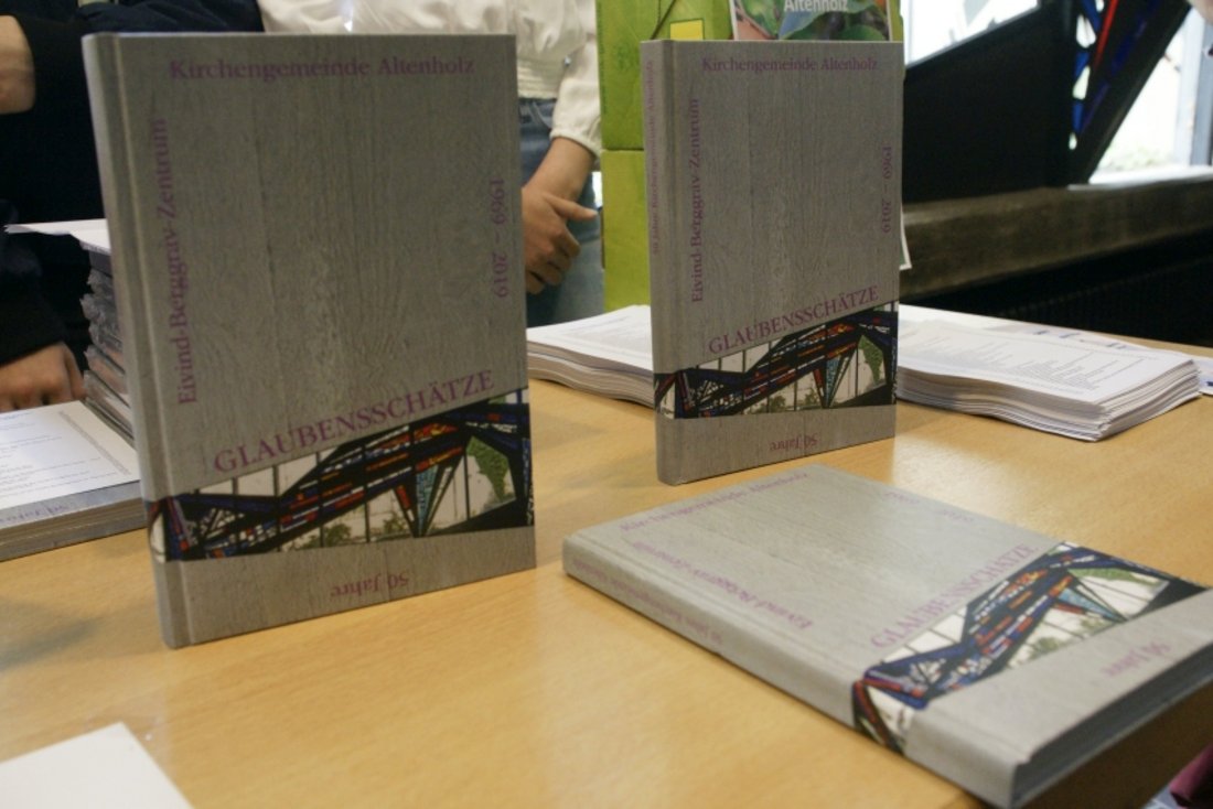 Nach dem Gottesdienst strömen die vielen großen und kleinen Besucherinnen und Besucher nach Draußen. Einige besorgen sich zuerst die gedruckten „Glaubensschätze“. Dabei handelt es sich um das Jubiläumsbuch der Kirchengemeinde in dem Menschen von ihrem gelebten christlichen Glauben erzählen, das viele Bilder enthält und den Namensgeber des EBZ, den norwegischen Theologen Eivind Berggrav vorstellt. Viele decken sich mit Kaffee, Kuchen oder Herzhaftem ein, die Kinder spielen auf dem Freigelände der Kita Ahoi. Hier gibt es Spiele wie vor 50 Jahren: Dosenwerfen, Schatzsuche, Sackhüpfen und Angeln im kleinen Becken. Vor dem EBZ baut sich derweil die Band "Downstairs Dixieland Company" auf und sorgt mit ihrem Sound dafür, dass die Bänke vor dem 50 Jahre alten EBZ noch lange besetzt bleiben.