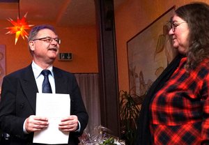 Nach dem Gottesdienst lud die Gemeinde zum Empfang ins Restaurant Delphi. Dort wurden noch einmal die Küsterin Heike Holm und ihre Vertreterin von Peter Eichen verabschiedet, dem stellvertretenden Vorsitzenden des Kirchengemeinderats. Die beiden Bürgermeister von Alt Duvenstedt und Fockbek bedankten sich für den Dienst von Andrea Mallek, auch Kolleginnen und Kollegen sowie Mitglieder der verschiedenen Chöre sagten Danke und überreichten ihr Geschenke.