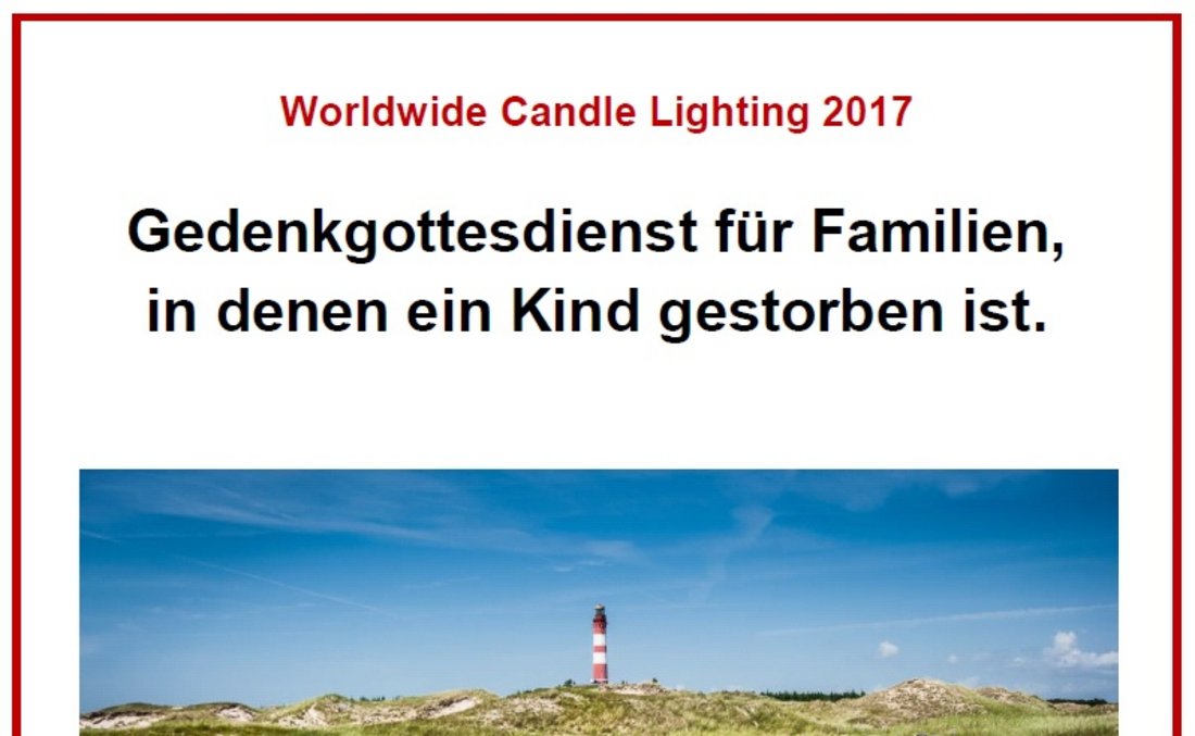 Rendsburg/Fockbek - Jedes Jahr am 2. Sonntag im Dezember stellen Menschen, denen ein Kind gestorben ist, rund um die ganze Welt um 19 Uhr brennende Kerzen in die Fenster. Während die Kerzen in der einen Zeitzone erlöschen, werden sie in der nächsten entzündet, so dass eine Lichterwelle in 24 Stunden um die ganze Welt geht. Jedes Licht im Fenster steht für das Wissen, dass diese Kinder das Leben erhellt haben und dass sie nie vergessen werden. Das Licht steht auch für die Hoffnung, dass die Trauer das Leben der Angehörigen nicht für immer dunkel bleiben lässt. Das Licht schlägt Brücken von einem betroffenen Menschen zum anderen, von einer Familie zur anderen, von einem Haus zum anderen, von einer Stadt zur anderen, von einem Land zum anderen. Zusätzlich werden in vielen Städten Zusammenkünfte und Gottesdienste organisiert.