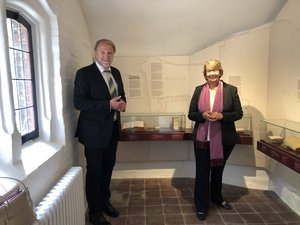 Die Ausstellung „Glaubensspuren“ handelt davon, wie die Menschen über die Jahrhunderte hinweg ihren Glauben als Lebensschatz erlebt haben. Dies war auch Thema der Predigt. Basis war das Evangelium für den Sonntag, ein Abschnitt aus der Gleichnisrede Jesu aus dem Matthäusevangelium „Vom Schatz im Acker und der kostbaren Perle“, wie der Text in der neuen Lutherübersetzung überschrieben ist (Matthäus 13, 44-46). Nach den Worten der Landesbischöfin geht es darin um das Suchen und Finden oder auch darum, gefunden zu werden. Darum, was in schwierigen Zeiten wie derzeit in der Corona Pandemie wirklich wichtig ist.
