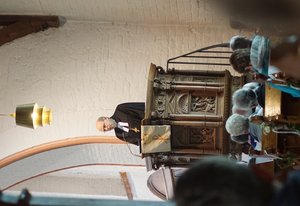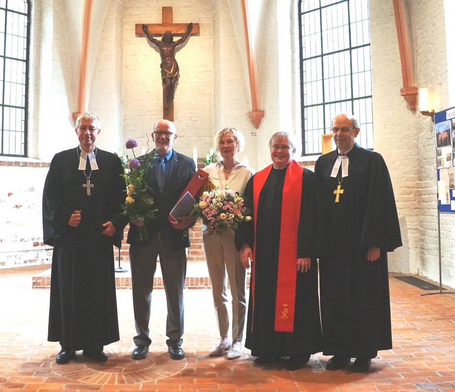 Propst Sönke Funck hatte nicht nur ein Grußwort des Kirchenkreises zu diesem Feiertag im Gepäck, sondern noch eine Überraschung, jedenfalls für den sichtlich erfreuten Klaus Sell, Vorsitzender der Kirchengemeinderates in Hütten: Sell bekam das Ansgarkreuz verliehen. Die dafür nötige Organisation hatte der Kirchengemeinderat sehr erfolgreich vor Sell verborgen. Bereits seit 1996 ist Sell im Kirchengemeinderat aktiv (damals noch Kirchenvorstand) und hat in dieser Zeit eine Vielzahl an Aufgaben und Ämtern übernommen: Diverse Ausschüsse, Vorsitz des Kirchengemeinderates, Synodaler im Kirchenkreis und in der Nordkirche, Mitglied des Kirchenkreisrates. Das Wirken von Klaus Sell in diesen 23 Jahren umschreibe, so Funck, "zusammen genommen das, was die Urkunde zum Ansgarkreuz meint mit 'großem persönlichen Einsatz in der kirchlichen Arbeit, vorbildlicher Förderung der Kirche, ihrer Werke und Einrichtungen sowie beispielhaftem Eintreten für einen tätigen christlichen Glauben in der Öffentlichkeit'." Es war Funck anzusehen, dass ihm die Verleihung auch eine persönliche Freude war: Er war von 1993 bis 2010 Pastor in Hütten, bevor er Propst im Kirchenkreis wurde. Bis auf seine ersten drei Jahre hatte er also auch immer eng mit Klaus Sell zu tun.