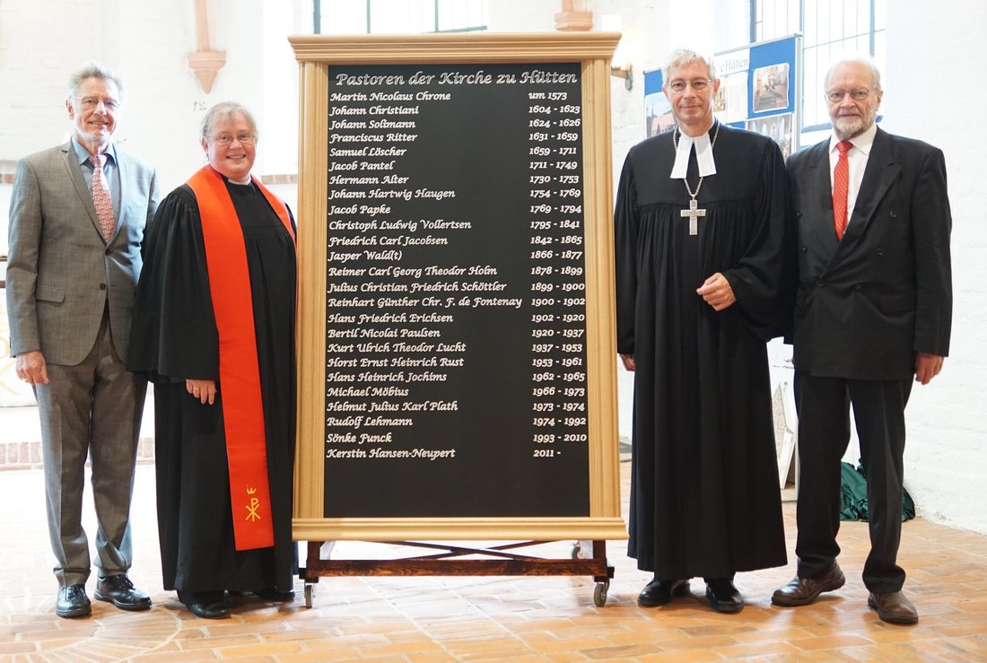 Im Anschluss an den Gottesdienst gab es noch einige Grußworte, die auf Geheiß der Pastorin nicht länger als jeweils zwei Minuten dauern durften. Daran hielten sich denn auch der Hüttener Bürgermeister Georg Beier, der Bünsdorfer Pastor Thies Feldmann sowie der ehemalige Hüttener Pastor Michael Möbius (mittlerweile im Ruhestand). Neben einigen Flachgeschenken zum Erhalt der Hüttener Kirche gab es vom Förderverein der Kirche ein besonderes Geschenk: Eine Ehrentafel, auf der alle Pastoren und die Pastorin der Hüttener Kirche bis zurück ins Jahr 1573 aufgeführt sind.Nach dem offiziellen Teil konnte die Festgemeinde historisches Bildmaterial zur Kirche im Chorraum bestaunen und bei Suppe und Getränken mit den ehemaligen Pastoren Michael Möbius (1966 bis 1973) sowie Hans Heinrich Jochims (1962 bis 1965) über vergangene Zeiten und neue Erlebnisse plaudern.